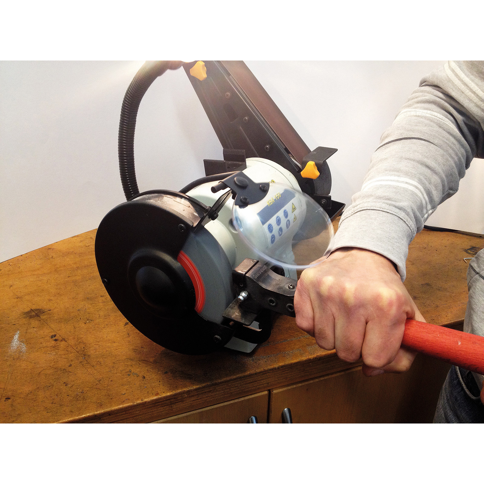 - Sie vereinfachen auch die seitlichen Bewegungen, um die gesamte Breite der Schleifscheibe abzurichten. Ein Schutzblech verhindert das Sprühen von Funken gegen Gesicht und Hände.