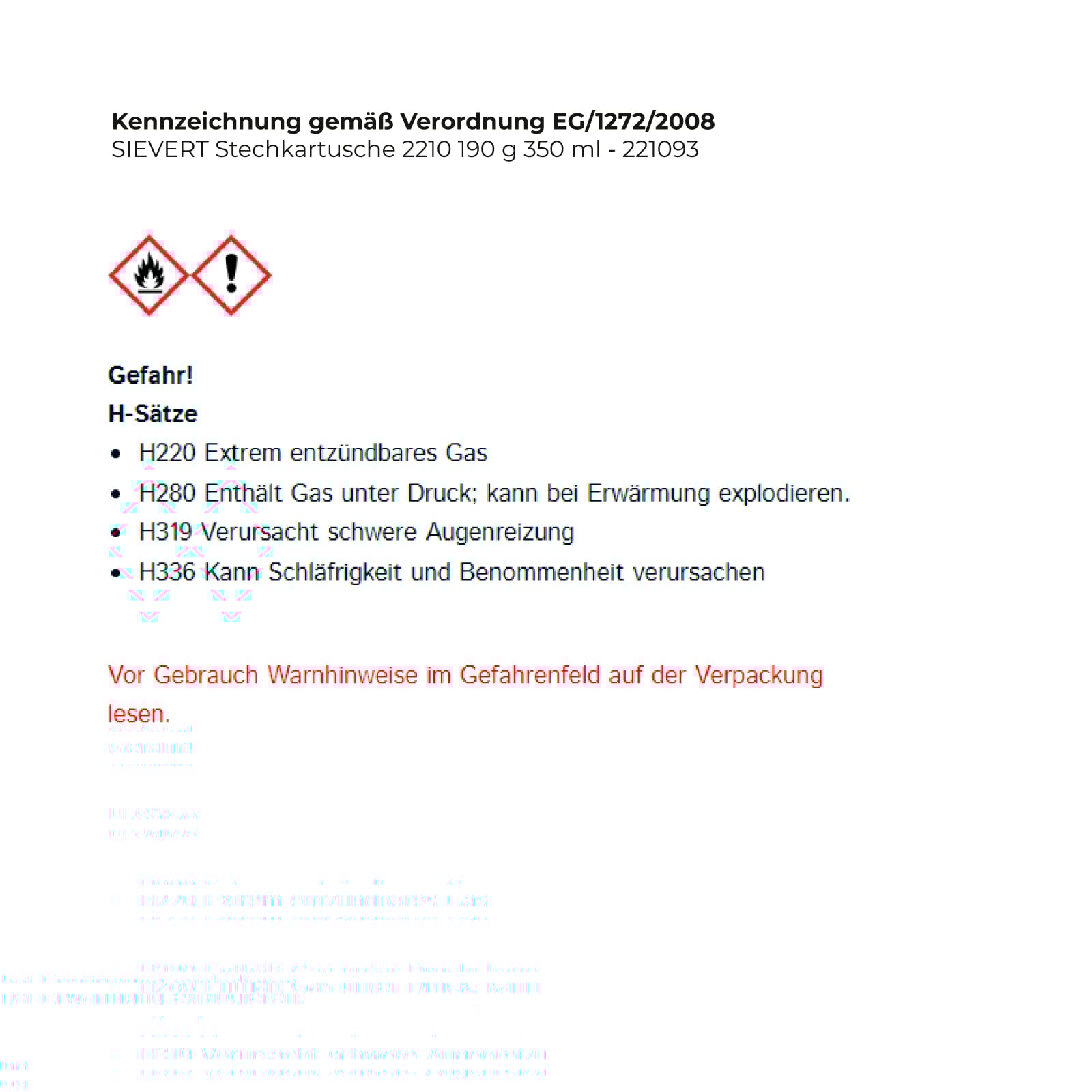 - H280 Enthält Gas unter Druck; kann bei Erwärmung explodieren.