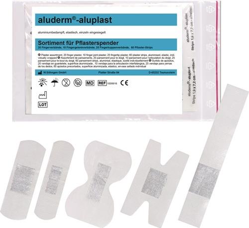 Spender ABS-Kunststoff mit Wandhalterung und Befestigungssatz drei Fachabteilungen, transparenter Klappdeckel mit Tunnelfach Pflaster einzeln hygienisch eingesiegelt sichere, übersichtliche und griffbereite Aufbewahrung Schutz vor Verschmutzung Inhalt: 115 Pflaster in 5 verschiedenen Abmessungen und Zuschnitten: je 30 aluderm®-aluplast Strips ca. 7,2 x 1,9 cm und ca. 7,2 x 2,5 cm 25 aluderm®-aluplast Fingerkuppenverbände 20 aluderm®-aluplast Fingerverbände ca. 12 x 2 cm 10 aluderm®-aluplast Fingergelenkverbände, einzeln hygienisch eingesiegelt Miniblock Notfallversorgungsnachweis
