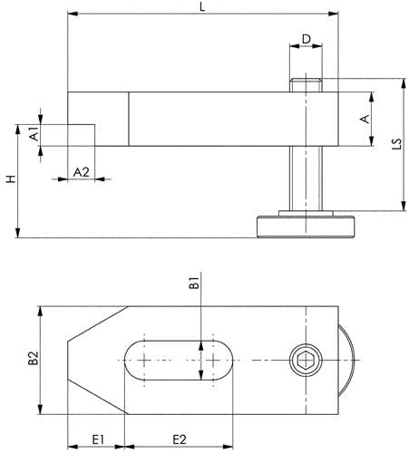 abgesetzt · mit verstellbarer Stützschraube Weitere technische Eigenschaften: · LS: 55mm · A1: 10mm · L: 125mm · Stärke: 25 mm · H: 13 - 62mm · Schlitzbreite: 18 mm · E1: 26mm · A2: 12,5mm · Gewicht: 1140g · B2: 50mm · Breite: 50 mm · A: 25mm · B1: 18mm · Länge: 125 mm · D: M16 · E2: 45mm · ähnl. DIN 6314 B1 x L: 18 x 125mm