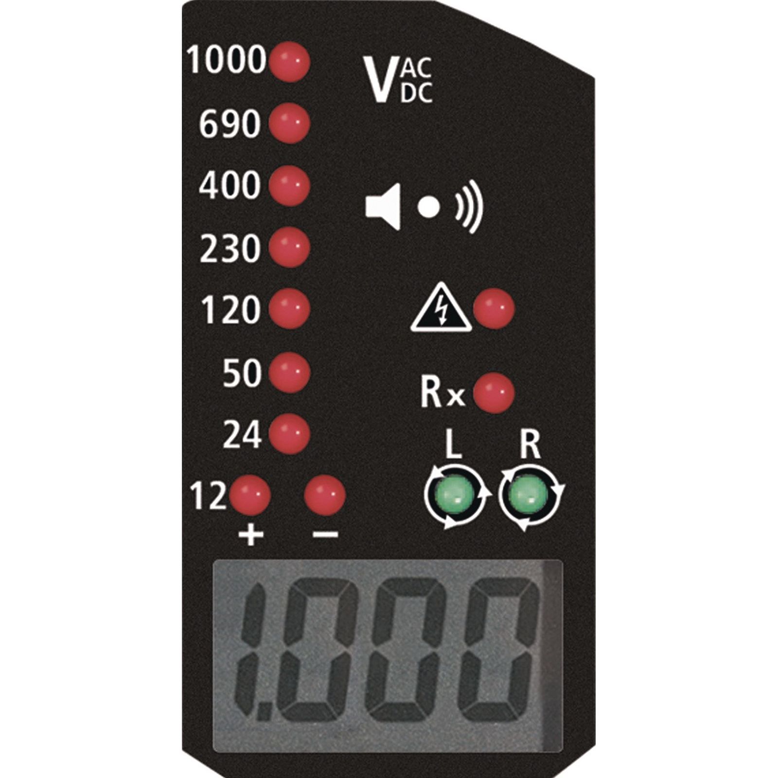 mit LED und großer Digitalanzeige sowie Messstellenbeleuchtung Technische Daten: LCD Anzeige: 4-stellig LED Anzeigestufen: 12 - 24 - 50 - 120 - 230 - 400 - 690 - 1000 V Polarität (+/-) einpolige Phasenprüfung: 100 - 1000 V AC (50/60 Hz) Drehfeldprüfung: 170 - 1000 V Phase-zu-Phase, AC 50/60 Hz Durchgangstest: 0 - 500 kΩ mit optischer und akustischer Anzeige Messkreiskategorie: CATIII/1000 V, CAT IV/600 V Normen: EN61243-3:2014 akustisches Signal: ja Weitere technische Eigenschaften: · prüfpflichtig: ja