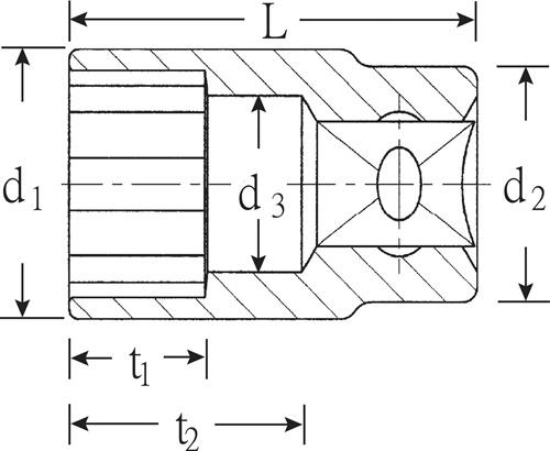 12,5 mm (1/2 ″)-Vierkantantrieb · 6-kant · HPQ®-Hochleistungsstahl · verchromt · DIN 3124/ISO 2725-1, ASME B 107.5M, DIN EN 3709 Weitere technische Eigenschaften: · Material: Chrom-Alloy-Stahl · d1: 45mm · d2: 28mm · d3: 31mm · Gewicht: 235g · t1: 22mm · t2: 27mm