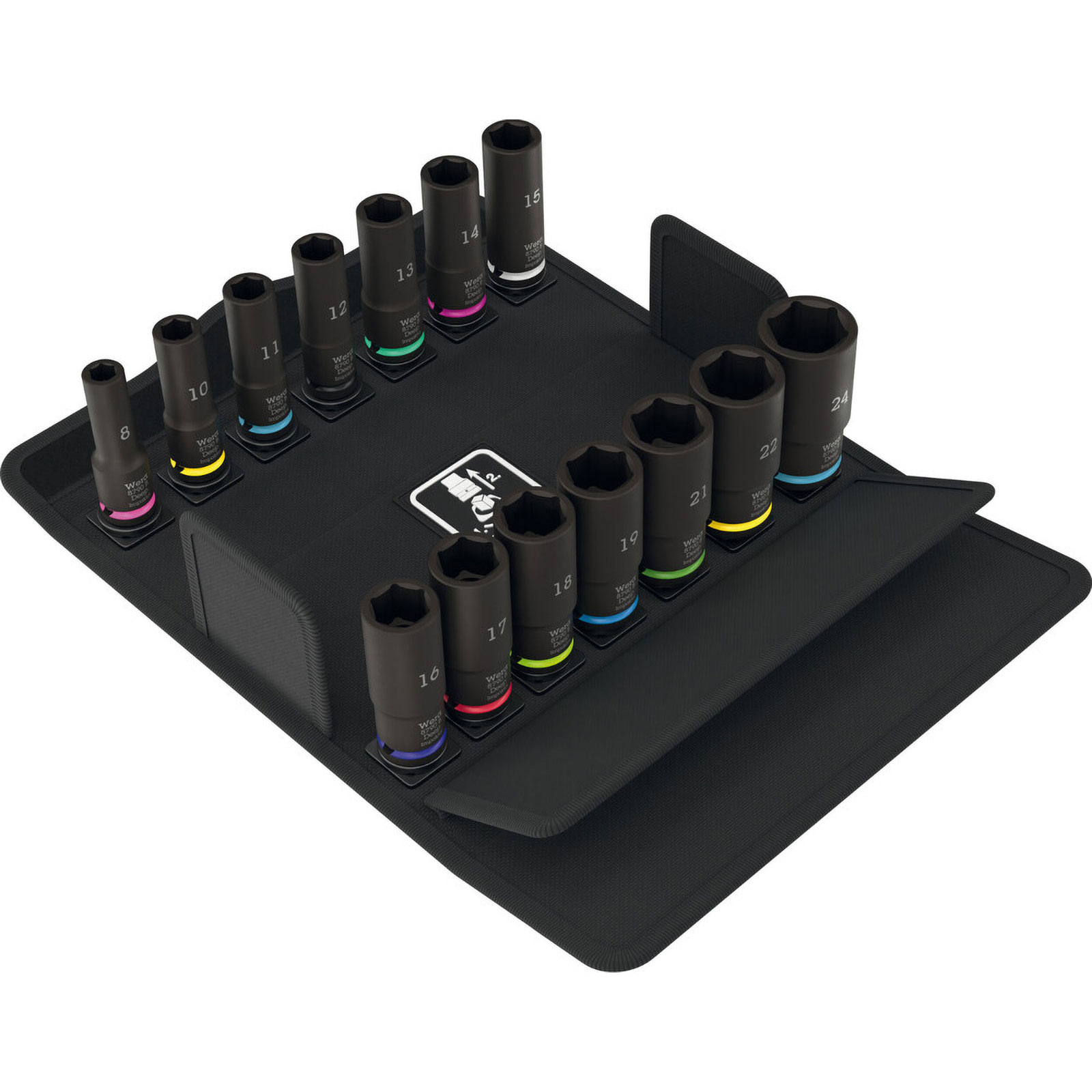 geringes Volumen und Gewicht für vereinfachte Mobilität · für den Einsatz mit Elektro- oder Druckluft-Schlagschraubern mit 3/8″ Antrieb · mit Haltestift-Bohrung · lange Ausführung für tiefliegende Verschraubungen und überstehende Gewindestangen · mit Sechskantprofil · Chrom-Molybdän, matt-schwarz · Take it easy Werkzeugfinder, mit Farbkennzeichnung nach Größen sowie Größenstempelung - zum einfachen und schnellen Finden der gewünschten Nuss Weitere technische Eigenschaften: · Verpackung: textile Box · Inhalt: 14-teilig · Geeignet für Wera 2go: ja · Icon links: Außensechskant · Icon rechts: Aussenvierkant · Schlagschrauberfest: ja · Take it easy Nuss: ja · Twist and Lock: ja