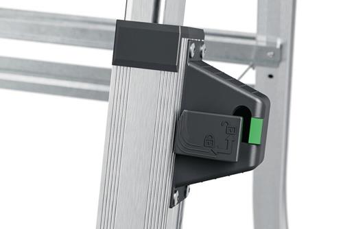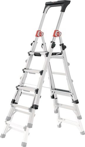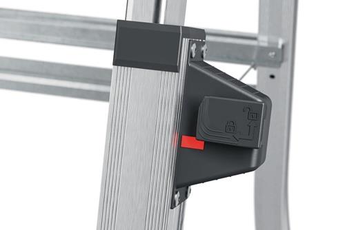 Aluminium · teleskopierbare Stufenstehleiter für flexible Arbeitshöhen · Steig- und Stützholme auf 3, 4 oder 5 Stufen einstellbar · Stufen-/Sprossen-Kombination · treppengängig einsetzbar, max. Treppenverstellung 440 mm · extragroße Standplattform B 299 x T 275 mm · Ablageschale mit unterschiedlich großen (Farb-) Dosen Abstellflächen · platzsparend · max. Gesamtbelastung 150 kg · Einfaches und sicheres Handling der Höhenverstellung durch Sicherheits-Verriegelungssystem mit Lock/Unlock-Indikator Weitere technische Eigenschaften: · Stufenabstand: 215mm · senkrechte Leiterhöhe: 1290-1730mm · Oberfläche: eloxiert · Stufentiefe: 85mm · Ausladung: 710-1010mm · prüfpflichtig: ja
