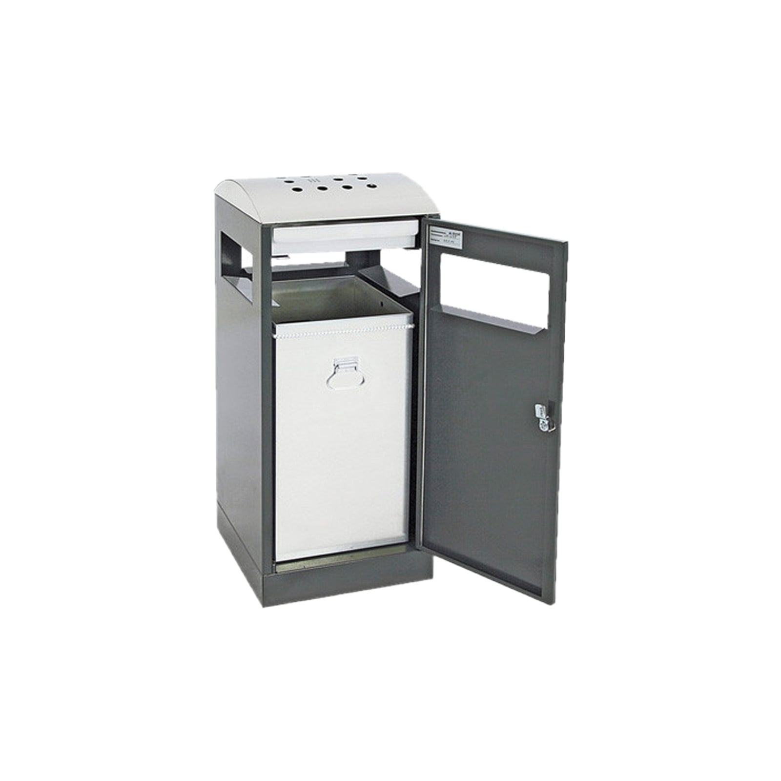 - Sammler für die Außenaufstellung, Abfall-Ascher-Kombi. Mit gelochtem Kopfelement aus gebürstetem Edelstahl zum Einwurf von Zigarettenabfällen. Aus vollständig verzinktem Qualitätsstahlblech gefertigt und hochwertig strukturiert pulverbeschichtet (licht- und wetterstabile Beschichtung). Im Behälterinnern sorgt ein verzinkter Innenbehälter aus Stahlblech und eine Ascherlade mit 5 Liter Fassungsvermögen für optimale Abfallaufnahme. Das Fassungsvermögen beträgt 40 Liter. Der Innenbehälter wird durch eine frontseitig eingelassene und per Vierkantschloss verschließbare Flügeltüre entnommen (Vierkantschlüssel werden mitgeliefert). Abfalleinwurf von allen Seiten möglich. Frontseitig sorgen 2 Stellfüße für den Ausgleich bei Unebenheiten. Mit den serienmäßig mitgelieferten Befestigungsprofilen kann der Behälter im Boden verschraubt werden. Der Artikel wird vollständig in Deutschland hergestellt und wird in einer TÜV-zertifizierten Produktionsstätte hergestellt. Der Hersteller gewährt eine Garantie von 5 Jahren. Farbgebung Korpus: anthrazitgrau RAL 7016, Farbgebung Kopfelement: Edelstahl