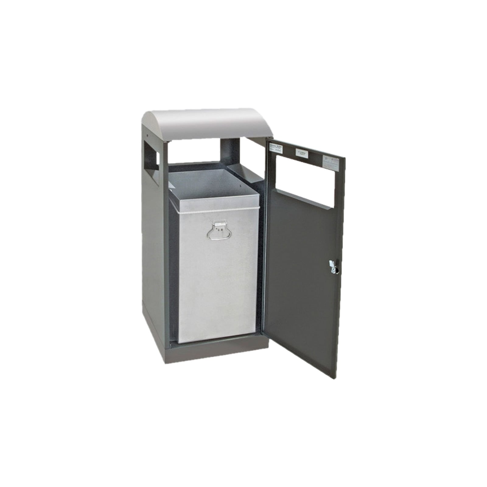 - Sammler für die Außenaufstellung, mit Kopfelement aus gebürstetem Edelstahl. Aus vollständig verzinktem Qualitätsstahlblech gefertigt und hochwertig strukturiert pulverbeschichtet (licht- und wetterstabile Beschichtung). Im Behälterinnern sorgt ein verzinkter Innenbehälter aus Stahlblech für für optimale Abfallaufnahme. Das Fassungsvermögen beträgt 90 Liter. Der Innenbehälter wird durch eine frontseitig eingelassene und per Vierkantschloss verschließbare Flügeltüre entnommen (Vierkantschlüssel werden mitgeliefert). Abfalleinwurf von allen Seiten möglich. Frontseitig sorgen 2 Stellfüße für den Ausgleich bei Unebenheiten. Mit den serienmäßig mitgelieferten Befestigungsprofilen kann der Behälter im Boden verschraubt werden. Der Artikel wird vollständig in Deutschland hergestellt und wird in einer TÜV-zertifizierten Produktionsstätte hergestellt. Der Hersteller gewährt eine Garantie von 5 Jahren. Farbgebung Korpus: anthrazitgrau RAL 7016, Farbgebung Kopfelement: Edelstahl