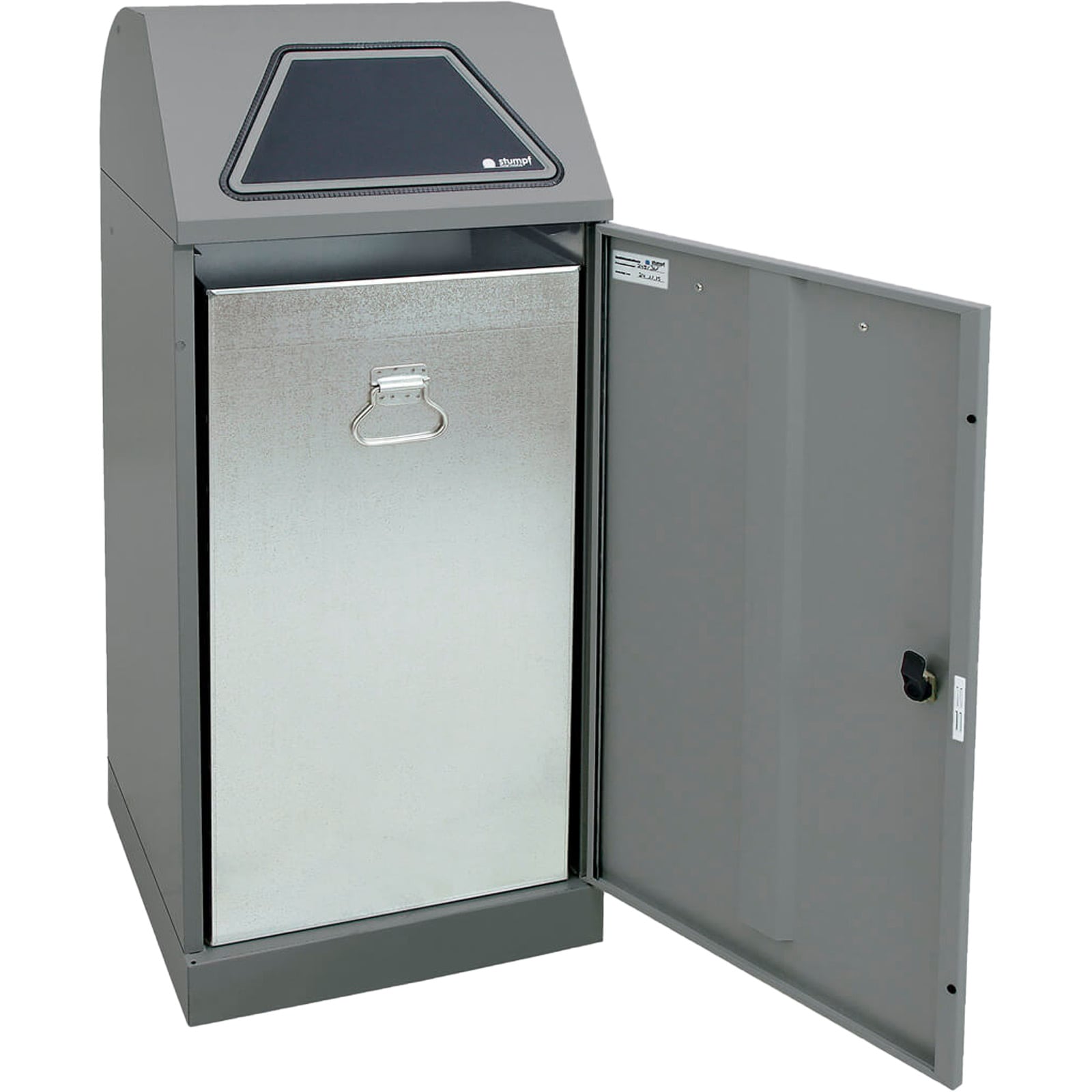 - Der Sammler ist aus vollständig verzinktem Qualitätsstahlblech gefertigt und hochwertig strukturiert pulverbeschichtet. Im Behälterinnern sorgt ein Innenbehälter aus ebenfalls verzinktem Stahlblech für optimale Abfallaufnahme. Das Fassungsvermögen beträgt 120 Liter. Der Innenbehälter wird durch eine frontseitig eingelassene und per Vierkantschloss verschließbare Flügeltüre entnommen (Vierkantschlüssel wird mitgeliefert). Die Einwurfklappe schließt mittels Dämpfer verzögert und geräuschlos. Behälter feuer- und geruchshemmend. Zur farblichen Kennzeichnung der Einwurfklappe liegt dem Sammler ein Set mit 4 ProPads (= protect-pads, hochrobust, selbstklebend) in den Farben blau, gelb, grün und anthrazit bei. So entscheidet der Anwender selbst, welche Kennzeichnungsfarbe der Sammler tragen soll. Frontseitig sorgen 2 Stellfüße für den Ausgleich bei Unebenheiten. Der Behälter kann mit dem Rollensatz Art.-Nr. 5407000 auch nachträglich zur fahrbaren Variante umgerüstet werden. Dann beträgt die Gesamthöhe 1200 mm. Der Behälter wird vollständig in Deutschland gefertigt und ist TÜV/GS geprüft. Der Hersteller gewährt eine Garantie von 5 Jahren. Außerdem ist der Behälter zertifiziert selbstlöschend und als nicht brennbar eingestuft (gem. DIN 4102, Brandschutzklasse A1). Farbgebung Korpus: graualu-struktur, Farbgebung Einwurfklappe: ProPads