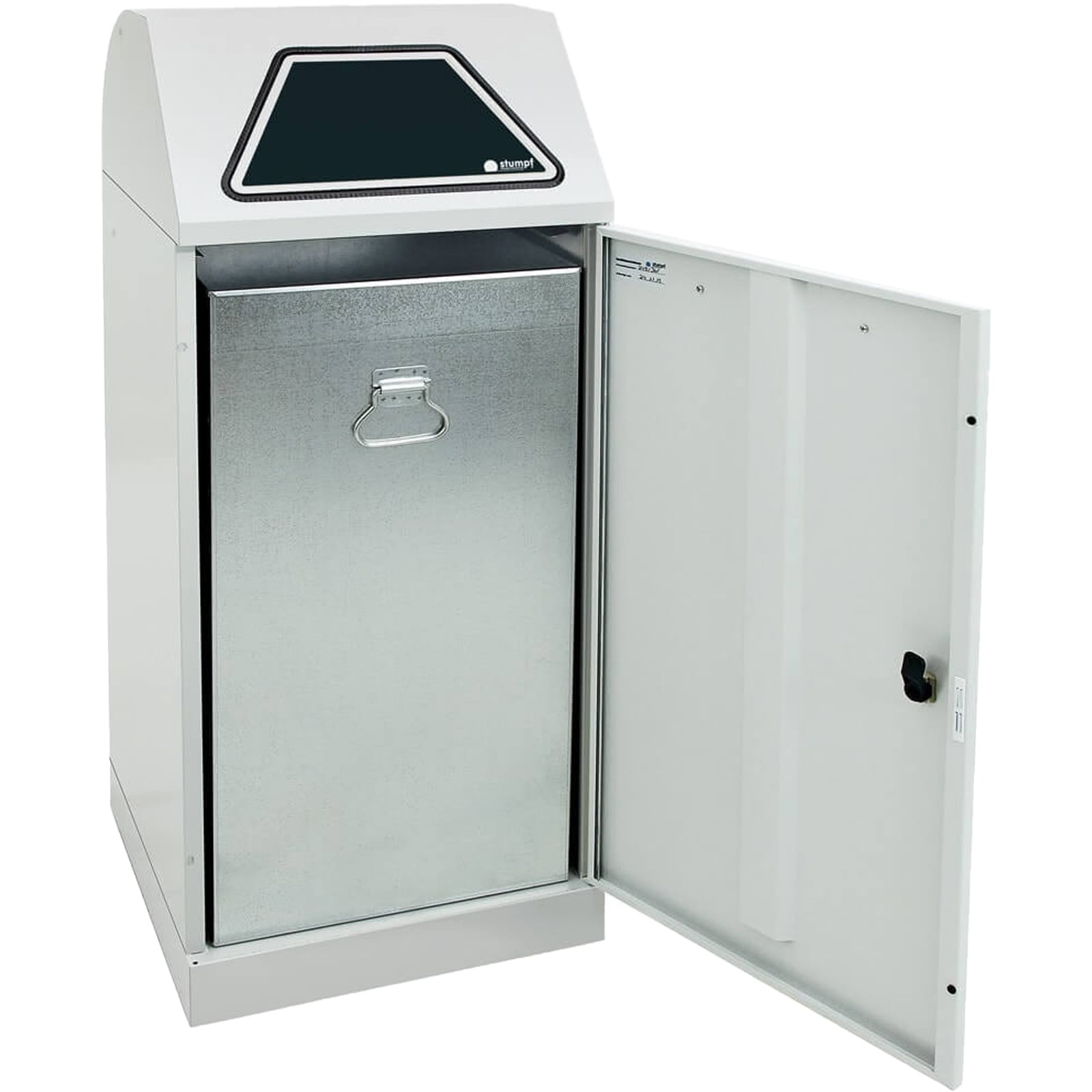 - Der Sammler ist aus vollständig verzinktem Qualitätsstahlblech gefertigt und hochwertig strukturiert pulverbeschichtet. Im Behälterinnern sorgt ein Innenbehälter aus ebenfalls verzinktem Stahlblech für optimale Abfallaufnahme. Das Fassungsvermögen beträgt 120 Liter. Der Innenbehälter wird durch eine frontseitig eingelassene und per Vierkantschloss verschließbare Flügeltüre entnommen (Vierkantschlüssel wird mitgeliefert). Die Einwurfklappe schließt mittels Dämpfer verzögert und geräuschlos. Behälter feuer- und geruchshemmend. Zur farblichen Kennzeichnung der Einwurfklappe liegt dem Sammler ein Set mit 4 ProPads (= protect-pads, hochrobust, selbstklebend) in den Farben blau, gelb, grün und anthrazit bei. So entscheidet der Anwender selbst, welche Kennzeichnungsfarbe der Sammler tragen soll. Frontseitig sorgen 2 Stellfüße für den Ausgleich bei Unebenheiten. Der Behälter kann mit dem Rollensatz Art.-Nr. 5407000 auch nachträglich zur fahrbaren Variante umgerüstet werden. Dann beträgt die Gesamthöhe 1200 mm. Der Behälter wird vollständig in Deutschland gefertigt und ist TÜV/GS geprüft. Der Hersteller gewährt eine Garantie von 5 Jahren. Außerdem ist der Behälter zertifiziert selbstlöschend und als nicht brennbar eingestuft (gem. DIN 4102, Brandschutzklasse A1). Farbgebung Korpus: lichtgrau RAL 7035, Farbgebung Einwurfklappe: ProPads
