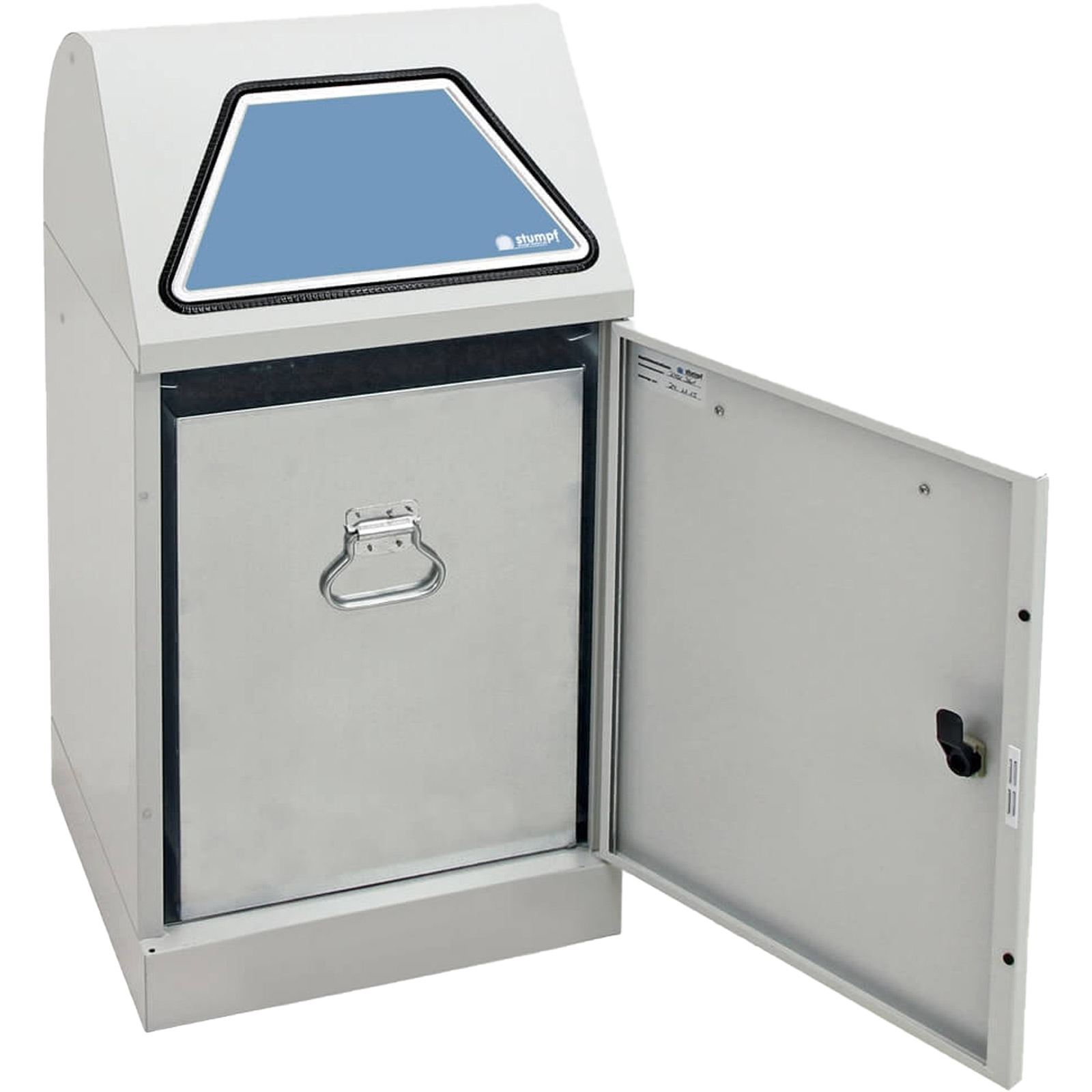 - Der Sammler ist aus vollständig verzinktem Qualitätsstahlblech gefertigt und hochwertig strukturiert pulverbeschichtet. Im Behälterinnern sorgt ein Innenbehälter aus ebenfalls verzinktem Stahlblech für optimale Abfallaufnahme. Das Fassungsvermögen beträgt 45 Liter. Der Innenbehälter wird durch eine frontseitig eingelassene und per Vierkantschloss verschließbare Flügeltüre entnommen (Vierkantschlüssel wird mitgeliefert). Die Einwurfklappe schließt mittels Dämpfer verzögert und geräuschlos. Behälter feuer- und geruchshemmend. Zur farblichen Kennzeichnung der Einwurfklappe liegt dem Sammler ein Set mit 4 ProPads (= protect-pads, hochrobust, selbstklebend) in den Farben blau, gelb, grün und anthrazit bei. So entscheidet der Anwender selbst, welche Kennzeichnungsfarbe der Sammler tragen soll. Frontseitig sorgen 2 Stellfüße für den Ausgleich bei Unebenheiten. Der Behälter kann mit dem Rollensatz Art.-Nr. 5407000 auch nachträglich zur fahrbaren Variante umgerüstet werden. Dann beträgt die Gesamthöhe 900 mm. Der Behälter wird vollständig in Deutschland gefertigt und ist TÜV/GS geprüft. Der Hersteller gewährt eine Garantie von 5 Jahren. Außerdem ist der Behälter zertifiziert selbstlöschend und als nicht brennbar eingestuft (gem. DIN 4102, Brandschutzklasse A1). Farbgebung Korpus: lichtgrau RAL 7035, Farbgebung Einwurfklappe: ProPads