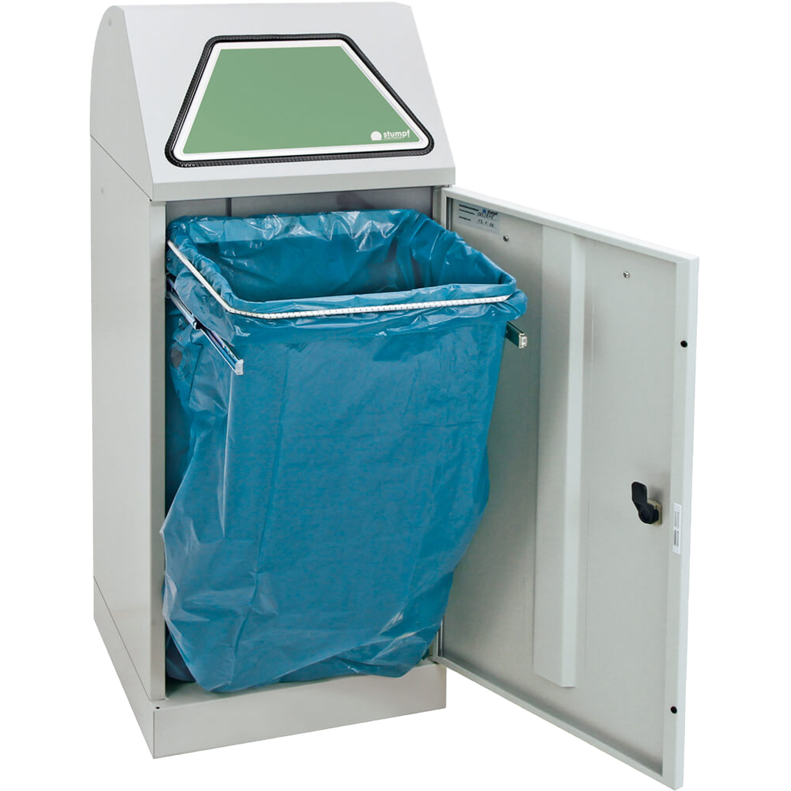 - Der Sammler ist aus vollständig verzinktem Qualitätsstahlblech gefertigt und hochwertig strukturiert pulverbeschichtet. Im Behälterinnern sorgt eine auf Teleskopschienen ausziehbare Aufnahmevorrichtung für den schnellen und bequemen Wechsel von Abfalltüten (ProSlide-System). Dabei sorgt ein Elast-Spannband für die Fixierung der Tüte. Das Fassungsvermögen beträgt 75 Liter. Die Abfalltüte wird durch eine frontseitig eingelassene und per Vierkantschloss verschließbare Flügeltüre entnommen (Vierkantschlüssel wird mitgeliefert).Die Einwurfklappe schließt mittels Dämpfer verzögert und geräuschlos und wirkt geruchshemmend. Zur farblichen Kennzeichnung der Einwurfklappe liegt dem Sammler ein Set mit 4 ProPads (= protect-pads, hochrobust, selbstklebend) in den Farben blau, gelb, grün und anthrazit bei. So entscheidet der Anwender selbst, welche Kennzeichnungsfarbe der Sammler tragen soll. Frontseitig sorgen 2 Stellfüße für den Ausgleich bei Unebenheiten. Der Behälter kann mit dem Rollensatz Art.-Nr. 5407000 auch nachträglich zur fahrbaren Variante umgerüstet werden. Dann beträgt die Gesamthöhe 1100 mm. Der Artikel wird vollständig in Deutschland hergestellt und wird in einer TÜV-zertifizierten Produktionsstätte hergestellt. Der Hersteller gewährt eine Garantie von 5 Jahren. Außerdem ist der Behälter als nicht brennbar eingestuft (gem. DIN 4102, Brandschutzklasse A1). Farbgebung Korpus: lichtgrau RAL 7035, Farbgebung Einwurfklappe: ProPads
