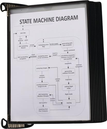 Komplett-Set mit Aluminiumschiene mit T-Clip zur Befestigung (ohne Werkzeug) der Aluminiumschiene an allen Aluprofilen mit 8er oder 10er Nut Befestigung mit Schrauben (nicht im Lieferumfang enthalten) oder Magnetband schnell einsatzbereit durch Neodym-Magnete, für ein schnelles austauschen der Tafeln Sichttafeln PP mit kunststoffummanteltem Stahldraht starke Metalldrehzapfen mit Easy-Load Öffnungssystem, die fordere Folie wird unter einen Eckverschluss geschoben für eine Aufnahme von bis zu 20 Blätter mit 5 Sichttafeln bzw. 10 Sichttafeln schwarz Anzahl Sichttafeln: 10 passend für: DIN A4 Farbe: schwarz Ausführung: mit Neodym-Magnet Material: PP