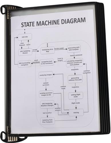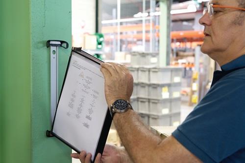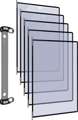 Komplett-Set mit Aluminiumschiene mit T-Clip zur Befestigung (ohne Werkzeug) der Aluminiumschiene an allen Aluprofilen mit 8er oder 10er Nut Befestigung mit Schrauben (nicht im Lieferumfang enthalten) oder Magnetband schnell einsatzbereit durch Neodym-Magnete, für ein schnelles austauschen der Tafeln Sichttafeln PP mit kunststoffummanteltem Stahldraht starke Metalldrehzapfen mit Easy-Load Öffnungssystem, die fordere Folie wird unter einen Eckverschluss geschoben für eine Aufnahme von bis zu 20 Blätter mit 5 Sichttafeln bzw. 10 Sichttafeln schwarz Anzahl Sichttafeln: 5 passend für: DIN A4 Farbe: schwarz Ausführung: mit Neodym-Magnet Material: PP