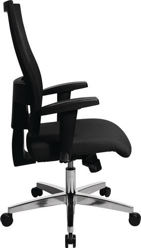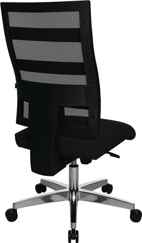 mit Punkt-Synchron-Technik (ohne Armlehnen) für überwiegend sitzende Tätigkeiten Aluminiumfußkreuz poliert Rückenlehne mit atmungsaktiver Netzbespannung schwarz, Rückseite mit elastischen Gummibändern, höhenverstellbar Flachsitz mit komfortabler Knierolle Bezug Rückenlehne 100 % Polyester, Sitzfläche 100 % Trevira CS Sitzfläche B 480 x T 480 mm Lehnenhöhe 600 mm Rollen für weiche Böden Lieferung erfolgt zerlegt Polsterfarbe: schwarz/schwarz Sitzhöhenverstellung: 450-550 mm Tragfähigkeit: 110 kg Sitzbreite: 480 mm Ausstattung: ohne Armlehnen Sitztiefe: 480 mm Marke: TOPSTAR Ausführung: mit Punktsynchrontechnik