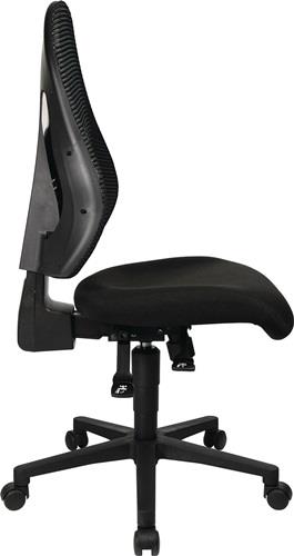 mit Synchron-Technik, (ohne Armlehnen) für überwiegend sitzende Tätigkeiten stabiles Polyamid Fußkreuz in schwarz individuell auf das Körpergewicht einstellbar und arretierbar bequemer Bandscheibensitz zur optimalen Abstützung im Beckenbereich Rückenlehne mit atmungsaktivem Elastan-Netzgewebe 100 % Polyester, in Höhe und Neigung verstellbar stufenlose Sitzhöhenverstellung Sitzbezug schwarz aus 100 % Polypropylen Sitzfläche B 500 x T 500 mm Lehnenhöhe 620-690 mm Rollen für weiche Böden Lieferung erfolgt zerlegt Polsterfarbe: schwarz/schwarz Sitzhöhenverstellung: 420-530 mm Sitzbreite: 500 mm Ausstattung: ohne Armlehnen Sitztiefe: 500 mm Ausführung: mit Synchrontechnik Lehnenhöhe: 620-690 mm Marke: TOPSTAR