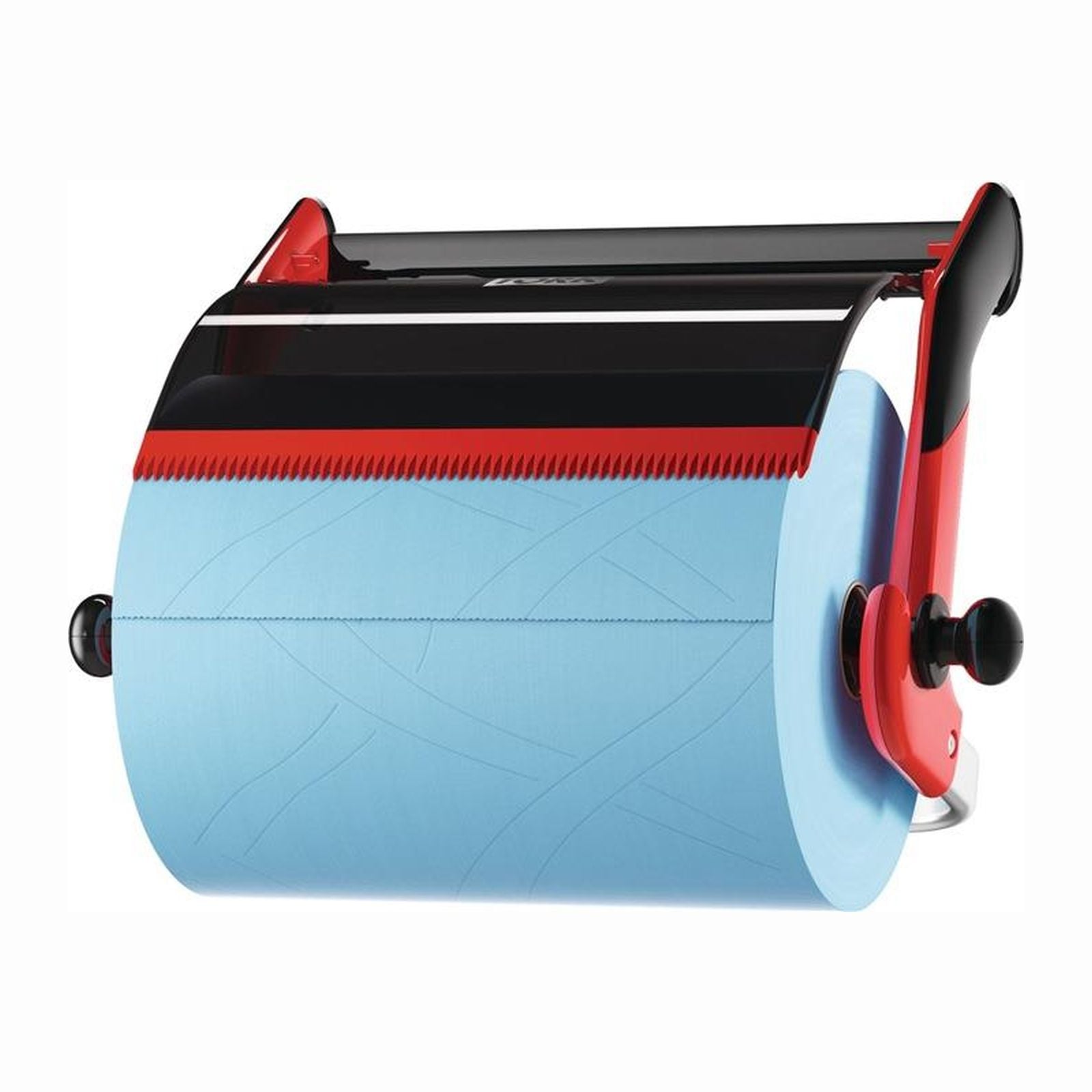 Merkmale VE/Palette: 23 Stück Höhe ca.: 463mm Breite ca.: 646mm Tiefe ca.: 274mm passend für: Putztuch-Rollen bis 430 mm Breite Farbe: rot/schwarz Marke: TORK Ausführung: mit glasfaserverstärkten Zähnen Material: Kunststoff/Metall