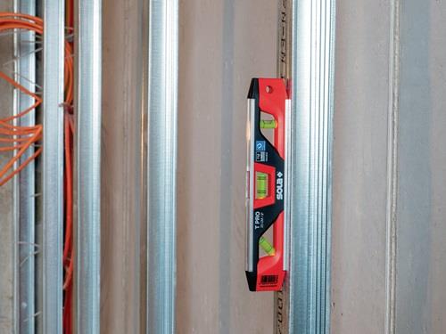 robuster Aluminium-Rahmen kombiniert mit ABS-Kunststoff garantiert lange Lebensdauer bei geringem Gewicht · Magnetstreifen mit hoher Haftkraft · Messfläche mit praktischer V-Nut für Rohre · Sichtfenster im Rahmen und große Libellen für optimale Ablesbarkeit · 4-Ring-Libelle zur Neigungsanzeige von 2% bei horizontaler Messung · kompakt, leicht, handlich Weitere technische Eigenschaften: · Breite: 15mm · Messgenauigkeit Normallage max.: 1mm/m · Farbe: rot/schwarz · Genauigkeit: 1mm/m