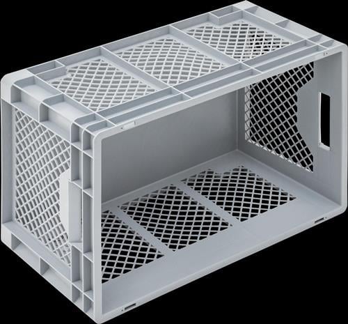 aus Polypropylen · für einen vielseitigen Einsatz im Lager- und Kommissionierbereich · abgestimmt auf Europaletten-Maß · resistent gegen die meisten Säuren und Öle · lebensmittelecht · temperaturbeständig von -20° bis +80° · Farbe grau · Boden geschlossen, Seitenwände durchbrochen Weitere technische Eigenschaften: · Innenhöhe: 317mm · Innenlänge: 554mm · Innenbreite: 354mm · Seitenwände: durchbrochen