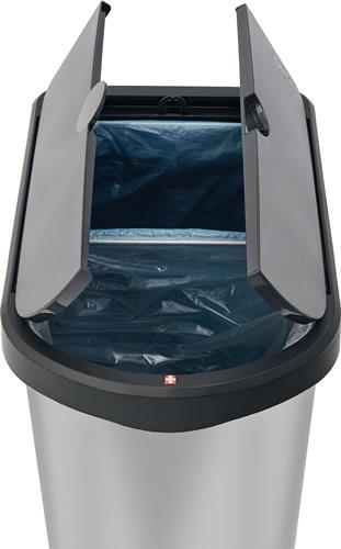 ovale Form · robusten Konstruktion aus flexiblen Kunststoffen · edler Metallic-Look · Dämpfer für sanftes und geräuschloses Schließen · Pedal für einfaches Öffnen · mit Gummifüße für ein festen Stand Weitere technische Eigenschaften: · Gewicht: 2,8kg