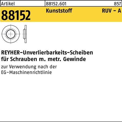 Artikel 88152 Kunststoff RUV - A REYHER-Unverlierbarkeits-Scheiben für Schrauben m. metr. Gewinde - Abmessung: 4/4,1x 9 x1,6 VE=S (100 Stück) Weitere technische Eigenschaften: · passend für: M4 · Durchmesser: 4mm · Form: RUV - A · Gruppencode: 88152.601 · Norm: REYHER-Artikel 88152 · Oberfläche: Ohne Oberflächenangabe