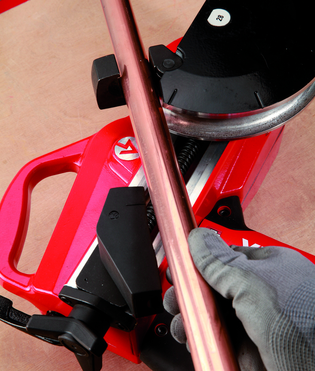 - Biegemaschine für kleine und mittlere Serien in der Werkstatt oder auf der Baustelle, bis Ø 35 mm (Kupfer) und Ø 40 mm (mehrschichtig).