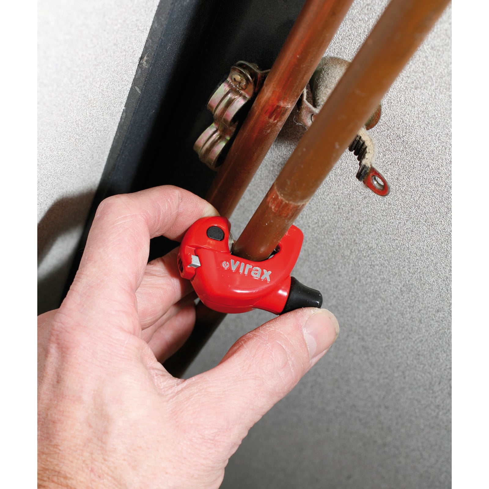 - Maximale Wandstärke: 2 mm. Extrem kompakter Rohrabschneider Geringer Platzbedarf zum Schneiden von Rohren an schmalen Stellen. unter Waschbecken, zwischen 2 Rohren, entlang einer Wand.
