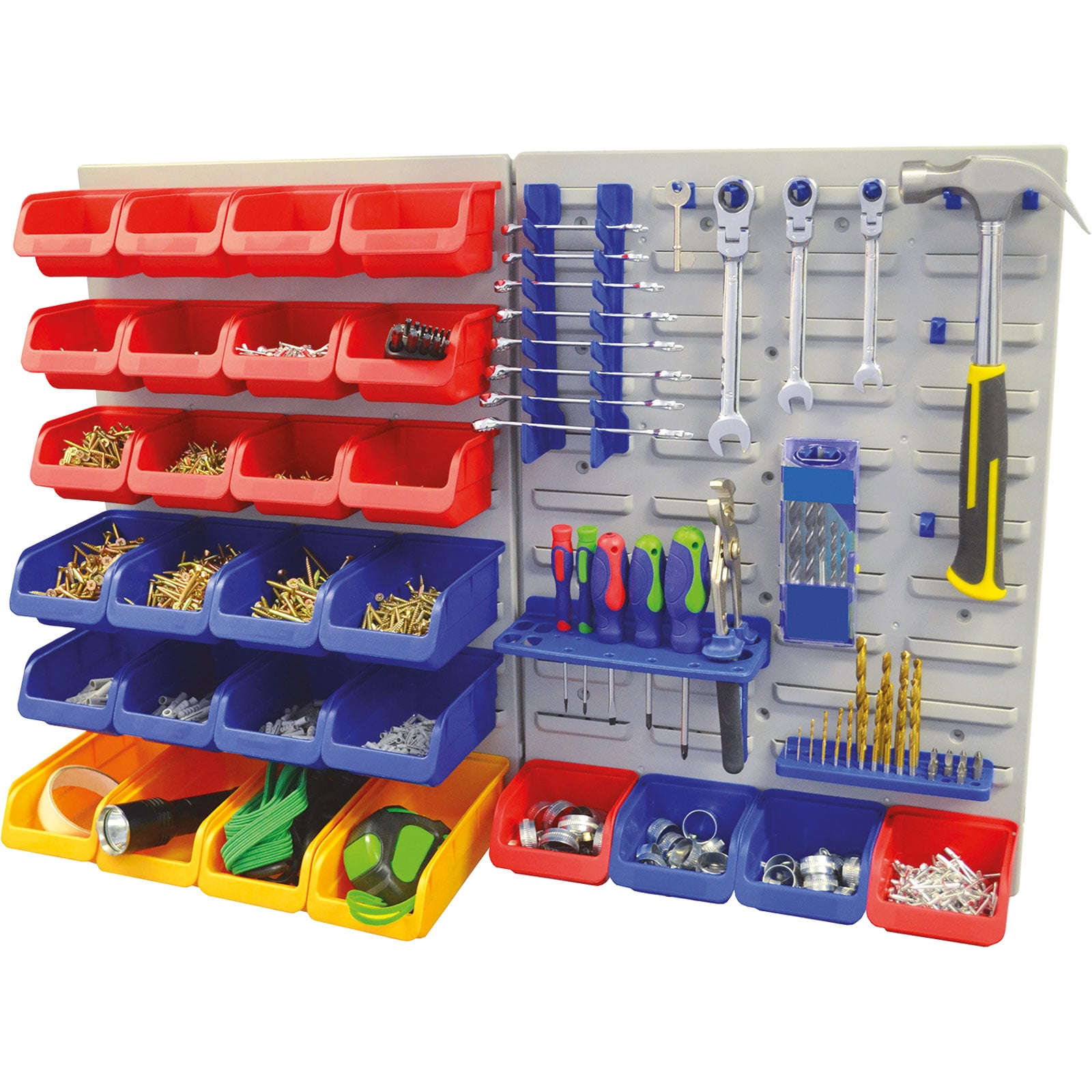 - Ebenso sind mittlere Ablagefächer inkludiert. Mit einer Größe von 14 cm x 10 cm und mit einer Belastbarkeit von ca. 1,5 kg. Die mitgelieferten Haken sind zum Aufhängen von Hämmern, Schraubenschlüsseln und noch vielen weiteren Werkzeuge konzipiert. Hier sind der Kreativität keine Grenzen gesetzt.
