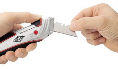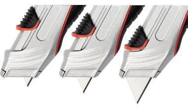 Die Klinge ist federbelastet und zieht sich automatisch zurück · sobald sie keinen Kontakt mehr mit dem Schneidegut hat (Schieber während des Schneidens nicht festhalten). Über ein Einstellrad ist die Schnitttiefe in 3 Stufen wählbar - um z. B. Beschädigungen des Kartoninhalts zu vermeiden. Einfacher Klingenwechsel mit Sicherungsriegel.