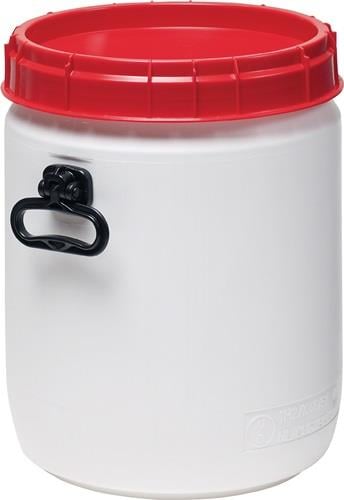 mit großer Einfüllöffnung mit Schraubverschluss stabile Kunststoffgebinde ohne Metallbestandteile stapelbar UN-X-Zertifizierung für Feststoffe luft- und wasserdicht orginalitätssicher zu verplomben, lebensmittelrechtliche Unbedenklichkeit max. Fülltemperatur bis 80 °C der Inhalt muss auf 30 °C abgekühlt sein, bevor man das Fass schließen und stapeln kann Inhalt: 34 l Einfüllöffnung-Ø: 295 mm Ausstattung: mit 2 Tragegriffen Farbe: weiß mit rotem Deckel Gesamthöhe: 447 mm Gesamt-Ø: 338 mm