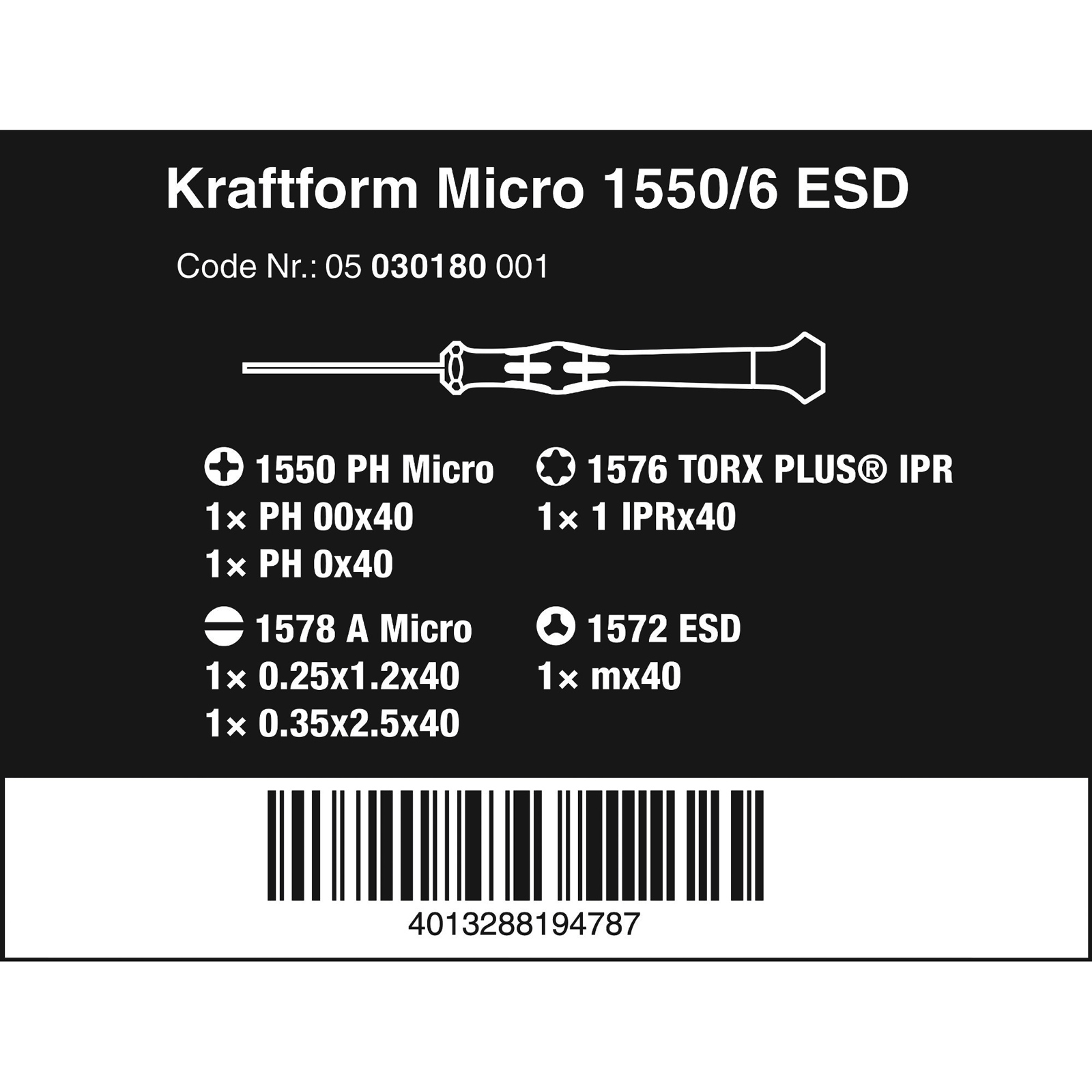 Elektrostatisch abgesicherter Wera Micro Schraubendrehersatz. Sicherer Schutz vor elektrostatischer Energie und damit verbundenen Schäden. Durch Abstützen der Hand auf der Drehkappe und durch die Schnelldrehzone unterhalb der Drehkappe ist blitzschnelles Zwirbeln möglich. Zeitintensives Umgreifen entfällt. Kraftzone mit integrierten Weichzonen sorgt für die Übertragung hoher Löse- und Anzugsmomente. Präzisionszone für den richtigen Drehwinkel bei Justierarbeiten. Die Wera Black Point-Spitze bietet Passgenauigkeit und optimierten Korrosionsschutz.