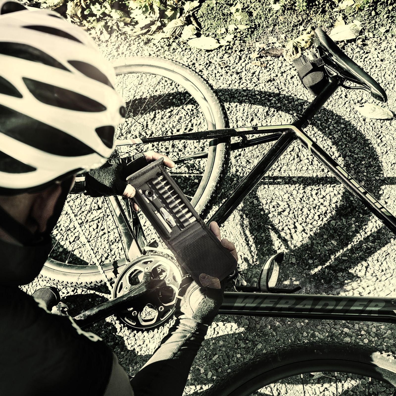 Fahrrad-Werkstätten und Radler aus Leidenschaft lieben das Schrauben am Fahrrad. Der Schraubwerkzeugspezialist Wera bietet mit dem Bicycle Set 1 ein Werkzeugsortiment, das dank kompakter und designorientierter textiler Falttasche sehr mobil ist und die gängigsten Schraubfälle am Fahrrad lösen kann. Die robuste Tasche enthält die Bit-Ratsche Zyklop Mini 1 und 10 Bits mit allen Vorteilen der Wera-Bit-Technologie, speziell auf die gängigsten Fahrradverschraubungen angepasst.