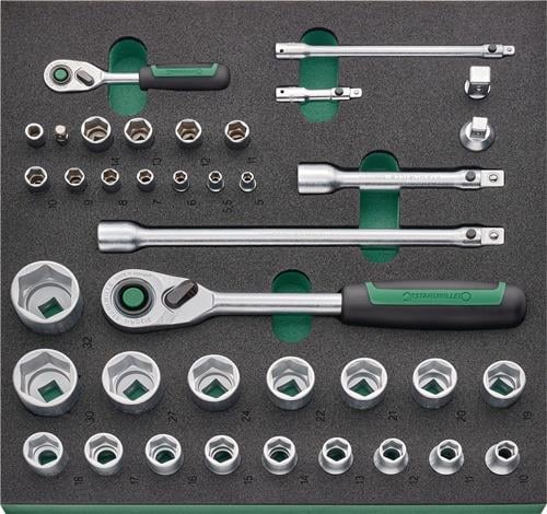mit 6 auf kugelgelagerten Teleskopschienen herausziehbaren Schubladen mit 100 % Auszug · automatischer Schubladeneinzug · strapazierfähige Kunststoffablageplatte aus ABS · mit Fächer für Kleinteile · mit Zentralverriegelung durch Zylinderschloss (nur eine Schublade gleichzeitig geöffnet) · abschließbar mittels eingebautem Zylinderschloss mit abklappbarem Schlüssel · öl- und säurebeständige Leichtlaufräder (D.125 mm) mit Fadenschutz zum Schutz der Lager vor Schmutz und Fäden · zwei Feststellbremsen · beidseitiges Lochwandsystem für einfache Installation von Zubehörartikeln · mit Papierrollenhalter · 2 Fahrgriffe · aus Stahlblech Maß über alles aufgebaut mit Griff und Rädern (B x T x H) 877 x 480,7 x 987 mm Maß nur Korpus (B x T x H) 736 x 480,7 x 831 mm Innenmaß Schubladen (B x T x H) Anzahl 4x 530 x 351 x 68 mm Tragkraft pro Schublade 30 kg Innenmaß Schubladen (B x T x H) Anzahl 1x 530 x 351 x 145 mm Tragkraft pro Schublade 30 kg Innenmaß Schubladen (B x T x H) Anzahl 1x 530 x 351 x 198 mm Tragkraft pro Schublade 45 kg statische Gesamtbelastbarkeit 500 kg Weitere technische Eigenschaften: · Gewicht: 82kg · Anzahl Werkzeuge: 157