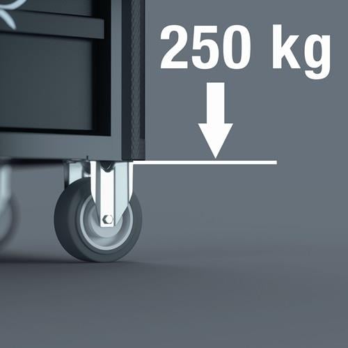 komplett mit 78-teiligem Werkzeugsortiment · 7 Schubladen (5 flache und 2 hohe) · 100 %iger Schubladen-Auszug mit kugelgelagerten Teleskopschienen, Selbsteinzug · minimales Kipprisiko durch Auszugsperre (nur eine Schublade kann geöffnet werden) · doppelwandige Ausführung · Vierkantlochung beidseitig Maße über alles aufgebaut mit Griff und Rädern (B x T x H) 785 x 518 x 1020 mm Maße flache Schubladen (B x H x T): 522 x 81 x 398 mm Maße hohe Schubladen (B x H x T): 522 x 166 x 398 mm Tragkraft pro Schublade 25 kg / statische Gesamtbelastbarkeit 1000 kg Weitere technische Eigenschaften: · Gewicht: 94kg · Schubladeninnentiefe: 398mm · Schubladeninnenbreite: 522mm · Schubladenhöhe: 166mm