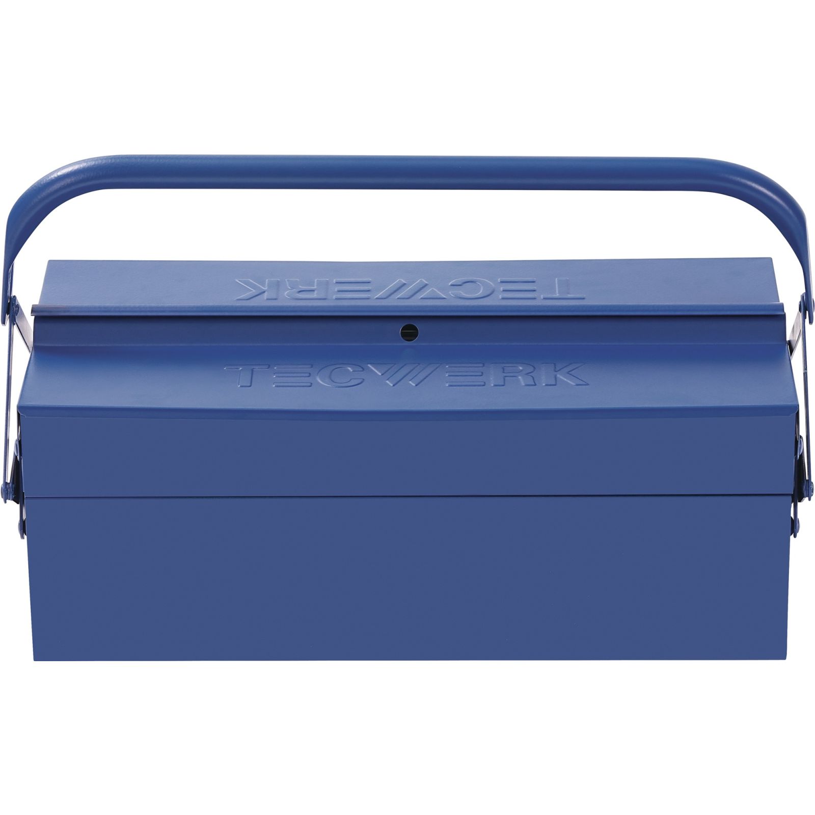 aus Stahlblech · blau lackiert · mit umlegbarem Tragegriff · abschließbar mittels Vorhängeschloss (gehört nicht zum Lieferumfang) · umgebördelte Kanten · Blechstärke: ca. 0,7 mm