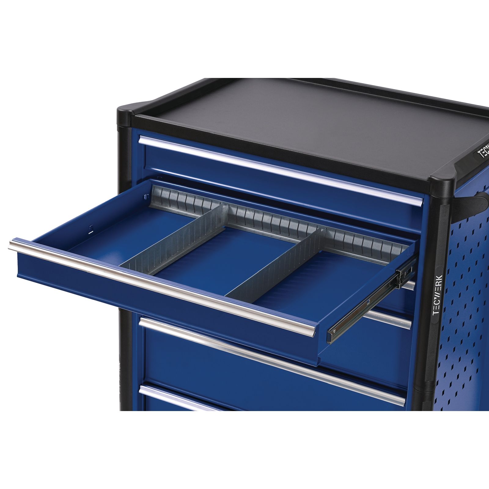 mit 6 Schubladen · Handgriff · kugelgelagerte, mit Teleskopschienen herausziehbare Schubladen mit 100 % Auszug mit jeweils einer Antirutschmatte · automatischer Schubladeneinzug · lackierte Metallabdeckung · Einteilerset für 4 Schubladen im Lieferumfang enthalten · abschließbar mittels eingebauten seitlichem Zylinderschloss mit 2 Schlüsseln · hochwertige Rollen Ø 127 mm – 2 starre und 2 lenkbare Rollen mit Feststellung · beidseitiges Lochwandsystem (9 x 9 mm) für einfache Installation von Zubehörartikeln · durchgehender, seitlicher Kunststoffkantenschutz Maß über alles aufgebaut mit Griff und Rädern (B x T x H) 745 x 475 x 950 mm Maß nur Korpus (B x T x H) 678 x 459 x 781 mm Innenmaß Schubladen (B x T x H) 3 x 568 x 398 x 75 mm Innenmaß Schubladen (B x T x H) 3 x 568 x 398 x 154 mm Tragkraft pro Schublade 25 kg / statische Gesamtbelastbarkeit 300 kg Weitere technische Eigenschaften: · Anzahl Längsteiler: 8 · Anzahl Querteiler: 8 · Gewicht: 63kg · Schubladeninnentiefe: 398mm · Schubladeninnenbreite: 568mm · Schubladenhöhe: 75mm,154mm