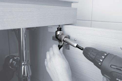 mit abgewinkeltem Kopf (105°) für den Einsatz im konv. Akkuschrauber Stahlgehäuse für Bits C 6,3 und E 6,3 mit Schnellwechselfutter und starkem Dauermagnet Haltegriff verstellbar (48 Positionen) Länge ca. 170 mm Eckmaß ca. 50 mm