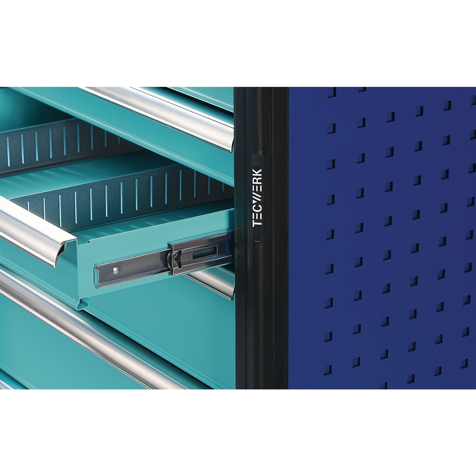 komplett mit 96-teiligem Werkzeugsortiment · mit 6 Schubladen · Handgriff · kugelgelagerte, mit Teleskopschienen herausziehbare Schubladen mit 100 % Auszug mit jeweils einer Antirutschmatte · automatischer Schubladeneinzug · Einteilerset für 4 Schubladen im Lieferumfang enthalten · mit Zentralverriegelung (nur eine Schublade gleichzeitig geöffnet) · abschließbar mittels eingebauten Zylinderschloss mit 4 Schlüsseln · beschriftbare Schubladen · Kunststoffabdeckung · hochwertige PVC-Rollen Ø 127 mm– 2 starre und 2 lenkbare Rollen mit Feststellung · beidseitiges Lochwandsystem (9 x 9 mm) für einfache Installation von Zubehörartikel · 2 Dosenhalter mit Lochung für Schraubendreher (im Lieferumfang enthalten) · durchgehender seitlicher Kantenschutz robuste Ablagefläche aus Polypropylen mit Ablagefächer für Kleinteile Maß über alles aufgebaut mit Griff und Rädern (B x T x H) 760 x 465 x 1030 mm Maß nur Korpus (B x T x H) 678 x 459 x 817 mm Innenmaß Schubladen (B x T x H) 3 x 568 x 398 x 75 mm Innenmaß Schubladen (B x T x H) 3 x 568 x 398 x 154 mm Tragkraft pro Schublade 30 kg / statische Gesamtbelastbarkeit 500 kg Weitere technische Eigenschaften: · Anzahl Längsteiler: 8 · Anzahl Querteiler: 8 · Schubladeninnentiefe: 398mm · Schubladeninnenbreite: 568mm · Schubladenhöhe: 75 mm,154mm